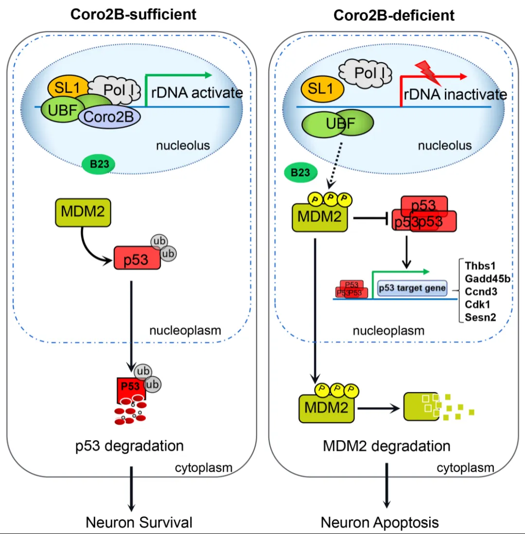 最后,研究人员发现,coronin 2B缺失引发的核仁应激反应,会抑制p53蛋白的降解,从而导致细胞核内p53的过渡积累与激活,启动细胞凋亡程序,引发神经元的死亡(图3)。