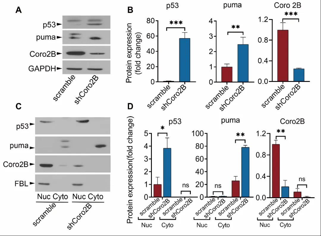图3. 敲减coronin 2B导致神经元内p53蛋白过渡积累与激活,启动细胞凋亡