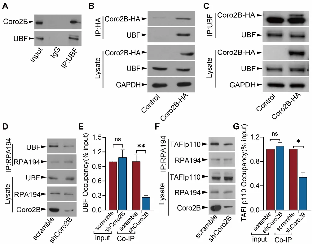 图2. Coronin 2B结合于UBF,调控rDNA转录起始复合物的组装