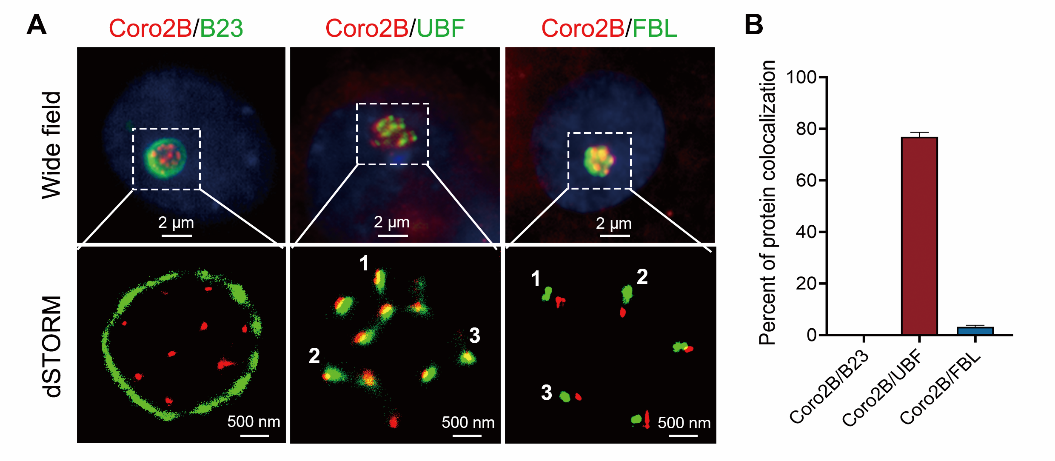图1. 超高分辨率显微成像分析coronin 2B与核仁不同组分的共定位情况