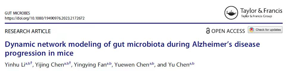 2023年2月,陈宇团队基于阿尔茨海默症(AD)小鼠的肠道菌群,构建了一套用于推测肠道菌群干预窗口期和干预靶点的动态复杂网络模型。本研究解析了AD小鼠肠道微生态拓扑结构随生长发育的动态变化,分析了AD小鼠肠道菌群最佳干预靶点及其对宿主神经的影响,为其他神经系统疾病的“脑-肠轴”研究提供了新的思路。相关成果发表于国际知名期刊 Gut Microbes 。