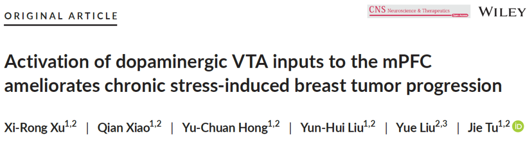 2021年2月,屠洁团队发现压力应激促进乳腺癌进程的神经环路机制;该研究表明情绪调节神经环路在癌症进程中的积极作用,并揭示了压力、情绪调节和乳腺癌进展之间的联系;为乳腺癌的治疗干预提供了新的见解。相关成果发表于国际知名期刊 CNS Neuroscience & Therapeutics 。