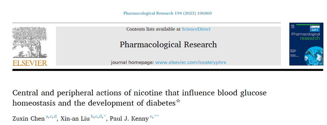 2023年7月,刘欣安团队和陈祖昕团队联合西奈山伊坎医学院Paul Kenny教授发表了关于尼古丁影响血糖稳态及糖尿病发生发展的综述文章。本文从大脑中枢,外周脏器(胰腺、肝脏、脂肪、肌肉)、以及中枢-外周脏器互作等三个方面深入分析了尼古丁调控血糖代谢的作用,最后推断出自主神经系统功能异常是介导尼古丁成瘾导致血糖紊乱的关键因素。该综述旨在解析吸烟成瘾人群糖尿病风险增加的机制,促进对相关疾病的理解和干预手段的开发。相关成果发表于国际知名期刊 Pharmacological Research 。