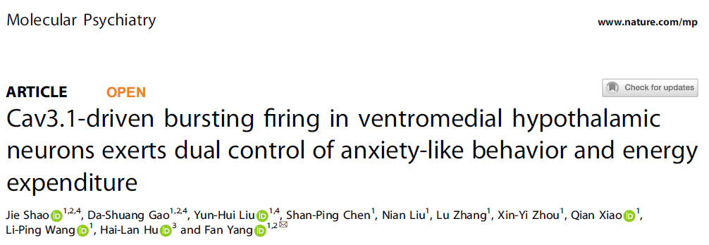 2022年3月,杨帆团队发现压力应激导致焦虑与能量代谢异常的神经生理机制;该研究揭示了慢性压力应激中下丘脑腹内侧核团(Ventromedial hypothalamus, VMH)神经元的簇状放电对焦虑及能量代谢的调控作用,而钙离子通道Cav3.1在上述调控中扮演了重要角色。相关成果发表于精神病学经典期刊 Molecular Psychiatry 。