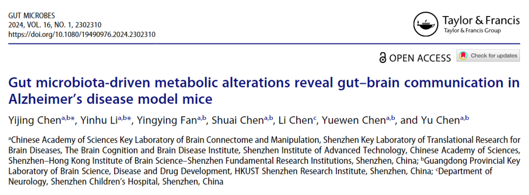 2024年1月,陈宇团队报道了阿尔茨海默症(AD)小鼠中肠道微生态的改变特征及其驱动的外周-中枢代谢图谱变化。本研究构建了肠道菌群与外周-中枢代谢产物的关联图谱,揭示了肠道菌群对宿主致病因素的适应和反馈机制,扩展了人们对“菌群-代谢产物-脑轴”的理解,并为开发针对肠脑交流的AD干预和治疗提供了新的方向。相关成果发表于国际知名期刊Gut Microbes。