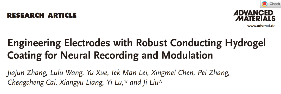 2023年1月,鲁艺和南方科技大学刘吉合作,通过聚合物链的固定和化学交联等方法增强了导电水凝胶与神经电极界面稳定性,使其在长期电刺激环和机械震荡等极端条件下保持仍能保持优异的性能。这种导电聚合物膜为中枢-外周环路功能性电刺激和电生理记录提供了高性能的神经界面。相关成果发表于国际知名期刊 Advanced Materials 。