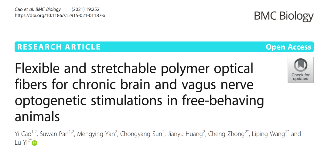 2021年11月,鲁艺和王立平、钟成合作,研发了一种柔性可拉伸的聚合物光纤。这种聚合物光纤能够耐受超过100%的拉伸形变,并且具有较低的杨氏模量和光损,以及优异的生物相容性。借助这种光纤,可在中枢-外周环路构建稳定的光学神经界面,实现对特定类型神经细胞的选择性调控,进而实现对特定生理状态或行为的干预。相关成果发表于国际知名期刊 BMC Biology 。