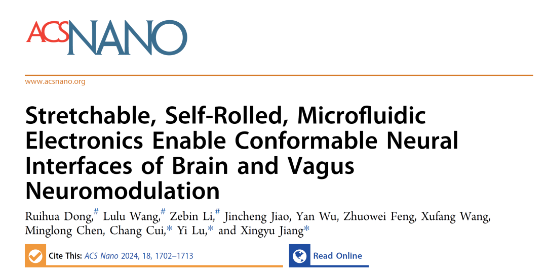 2024年1月,鲁艺和南方科技大学蒋兴宇、江苏省人民医院崔畅合作,通过微流体印刷技术研发了一种可拉伸、自卷曲的液态金属电极阵列。这种柔性电极阵列能否耐受高达600%的拉伸形变,具有较好的生物相容性和力学适应性,可用于在体水平大脑皮层和迷走神经神经电生理活动的记录,为中枢-外周环路的研究提供了重要的工具。相关成果发表于国际知名期刊 ACS Nano 。