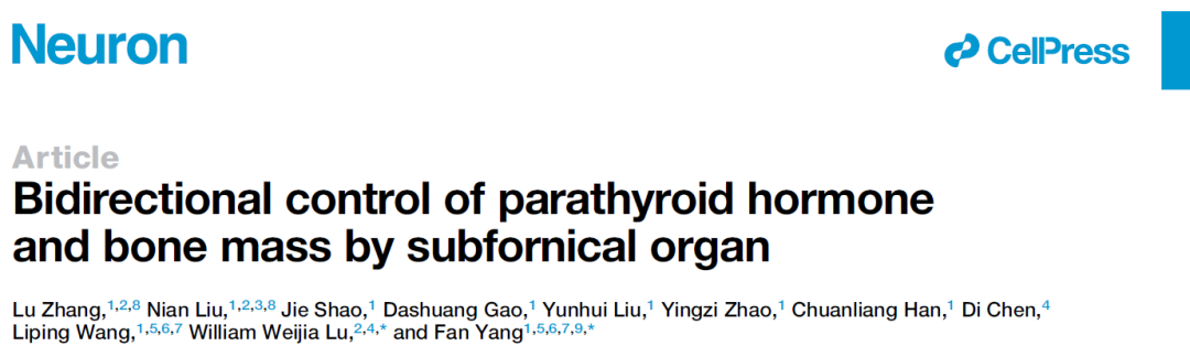 2023年6月,杨帆团队解析了大脑调控甲状旁腺分泌功能调节骨代谢的神经环路机制;该研究发现小鼠中枢神经系统穹窿下器官(subfornical organ, SFO)感受外周甲状旁腺激素(parathyroid hormone, PTH),并通过下丘脑室旁核(paraventricular nucleus, PVN)以及交感神经反馈调节外周PTH变化进而干预骨代谢的机制。相关成果发表于国际知名期刊 Neuron 。