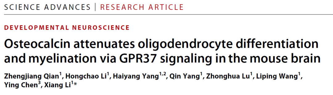 2021年10月,李翔团队发现骨源性因子骨钙素(Osteocalcin)能够通过其新受体GPR37调控少突胶质细胞分化及髓鞘化;该研究为从调节骨功能及骨源性因子角度探索维持神经系统功能新措施提供了理论依据,也为相关神经系统疾病的临床干预新策略和新靶点提供了科学依据。相关成果发表于国际知名期刊 Science Advance 。