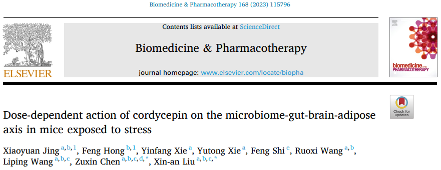 2023年10月,刘欣安团队和陈祖昕团队发表了关于虫草素对应激小鼠微生物-肠-脑-脂肪轴的剂量依赖性作用的研究论文。本研究提示了虫草素在压力应激引起的精神及代谢紊乱中的剂量相关作用,不同剂量虫草素逆转压力应激诱导的小鼠特异肠道菌和血清特定代谢物,对肠-脑-脂肪轴的关键作用因子的网络效应具有剂量差异性。本研究提示虫草素的最佳处方剂量应根据患者合并精神疾病和代谢紊乱的程度来决定,以提高预防或治疗效果,减少副作用,对于揭示中药的精确治疗具有重要意义。相关成果发表于国际知名期刊Biomedicine & Pharmacotherapy。
