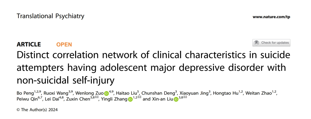 Translational Psychiatry丨解析青少年重度抑郁症患者自杀自伤的差异性临床特征网络图谱