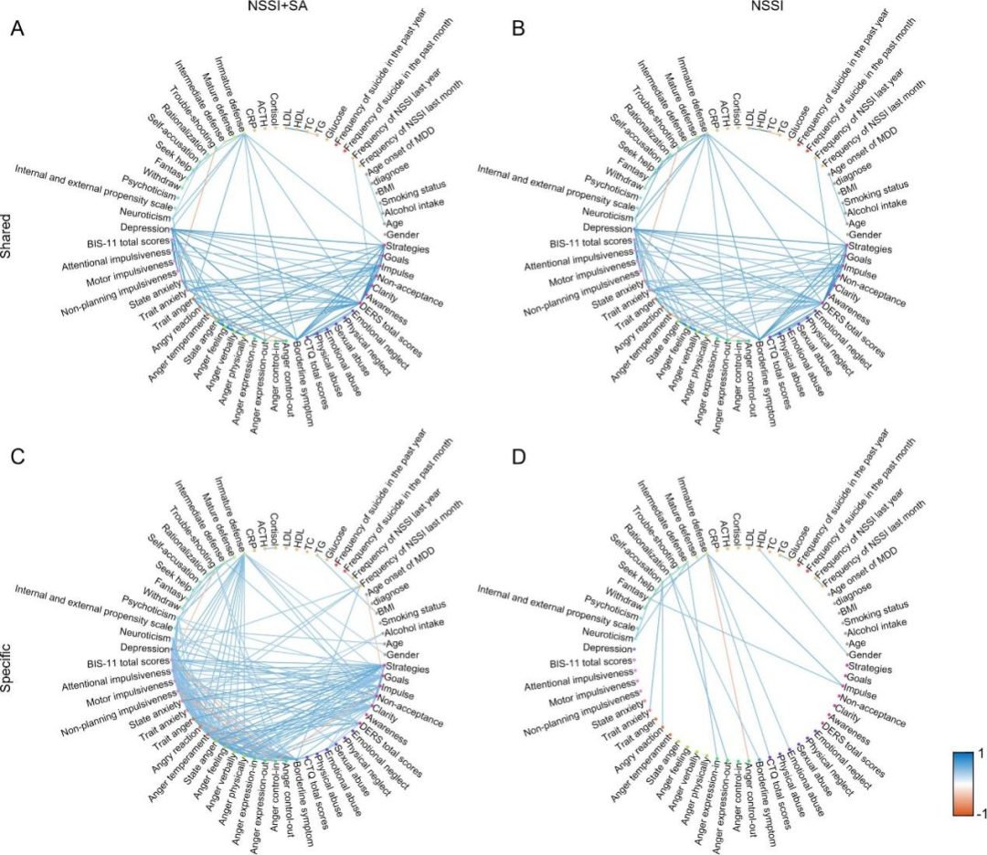 深圳先进院脑所刘欣安/陈祖昕团队与深圳市康宁医院抑郁障碍科合作,招募了130名患者,收集其11个心理量表(OSI、BDI-Ⅱ、STAI、BIS-11、DERS、TAXI-2、BSL-23、CTQ、 EPQ、DSQ、CSQ)中44个心理指标以及外周血生化数据(TG、TC、HDL、LDL、 cortisol、blood glucose、CRP and ACTH)等利用机器学习等方法进行分析研究,结果发现,NSSI+ SA组血清皮质醇和CRP水平明显低于NSSI组;进一步分析两组关联网络之间的差异,发现NSSI+ SA的参与者在冲动和情绪或愤怒表达方面的心理指标具有很强的相关性。在这项研究中,我们的目的是通过分析血液生化指标和心理指标的相关性来研究重度抑郁症伴自伤患者的自杀企图预测因素。我们认为,在临床中,监测任何单一因素都不足以预测自杀行为。除了冲动得分外,血清CRP和皮质醇水平被证明是重度抑郁症和自伤患者发生自杀行为的潜在危险因素。进一步探讨青少年MDD伴自伤的自杀未遂者与非自杀自伤者的差异表明,自杀未遂者具有独特的心理行为和生化指标的关联网络,并表现出更复杂的相关性。青少年MDD伴自伤患者的愤怒和冲动相关心理指标需要密切的临床监测。本研究为预测青少年重度抑郁症伴自伤患者的自杀风险提供线索,鉴于MDD等神经精神疾病的复杂性使用机器学习方法识别疾病亚型并进行预测,未来基于更大样本量的重度抑郁症伴自伤患者自杀预测因子的多变量预测模型正在持续研究中。