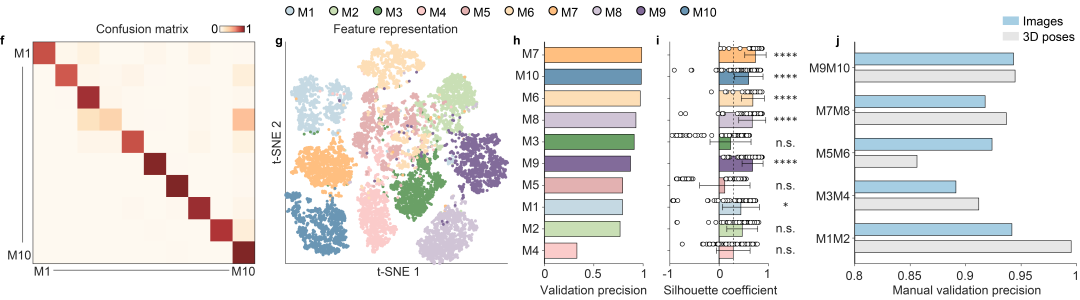 上述现有欧美技术的性能首先受制于人工标注数据集的数据量。在社交行为实验中,无法避免地需要在多种行为实验范式中使用不同的模式动物,深度学习模型精准与否取决于实验人员标注的视频的数量,每一个数据集的准备都需要花费实验人员数周的时间,极大地降低了实验效率,限制了上述工具的应用场景。SBeA在自由社交动物的姿态估计、身份识别和行为分类的三个阶段,分别针对性地提出了小样本的数据生成算法、零样本双向迁移学习方法和自然结构启发的无监督社交行为分解聚类策略,有效降低了每个阶段的数据标注量。
