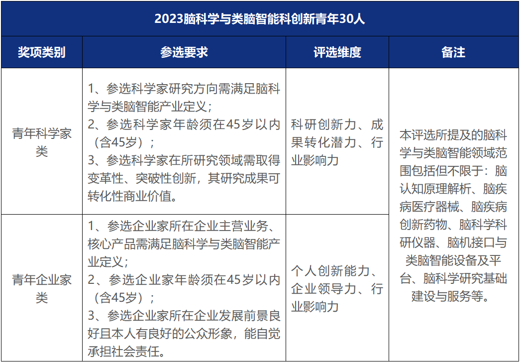 值此大会举办之际,深圳市脑科学学会、深圳市脑科学与类脑智能产业联盟、动脉网、VB100、蛋壳研究院联合发起2023脑科学与类脑智能科创新青年30人(“The New Brain 30”)评选活动,发掘国内脑科学与类脑智能产业创新领域的青年力量。活动通过深度了解脑科学与类脑智能前沿研究的进展与瓶颈、脑科学需求、脑科学产业应用的机遇与挑战,面向国内脑科学与类脑智能领域的青年科学家及青年企业家展开评选。