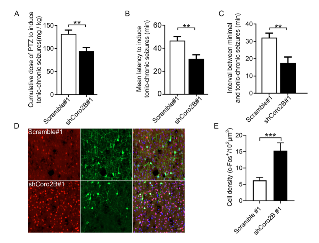 研究人员在coronin 2B敲减的皮层中观察到大量的神经元异位堆积,而这些异常的神经元有可能会导致皮层结构与功能紊乱,进而产生皮质发育不良的表现,如癫痫等。因此,研究人员对coronin 2B敲减小鼠进行药物戊烯四唑(Pentylenetetrazol,PTZ)诱导癫痫,发现与对照组相比,coronin 2B敲减小鼠只需要用更低剂量的PTZ以及在更短的时间内,便能产生明显的癫痫表现。同时,敲减coronin 2B的皮层区域出现了大量高度活化的神经元(c-Fos阳性细胞增多)。这些异常活化的神经元的过度放电是引发癫痫潜在原因。