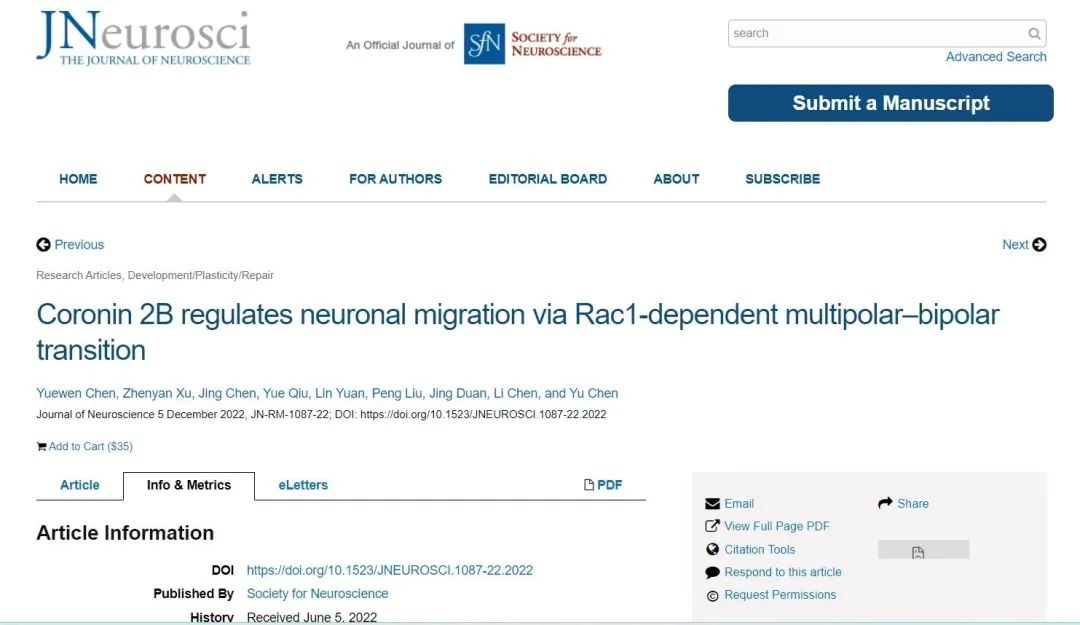 中国科学院深圳先进技术研究院陈宇/陈岳文课题组于2022年12月6日在Journal of Neuroscience上在线发表了题为“Coronin 2B regulates neuronal migration via Rac1-dependent multipolar–bipolar transition”的研究论文,报道了一种高度表达于神经系统中的F-actin细胞骨架调控蛋白coronin 2B调控皮层发育过程中的神经元迁移过程。该团队与其他课题组的前期研究提示,coronin家族基因变异与癫痫、发育迟缓等神经发育障碍性疾病有关。研究人员采用子宫内胚胎电转染技术(in utero electroporation)敲减小鼠胚胎期皮层中的coronin 2B,会造成皮层神经元的迁移障碍。而在出生之后,缺少coronin 2B的神经元仍然大量滞留于皮层的脑室区(Ventricular zone, VZ)和中间区(Intermediate zone, IZ),表明coronin 2B是皮层神经元完成细胞迁移所必需的。