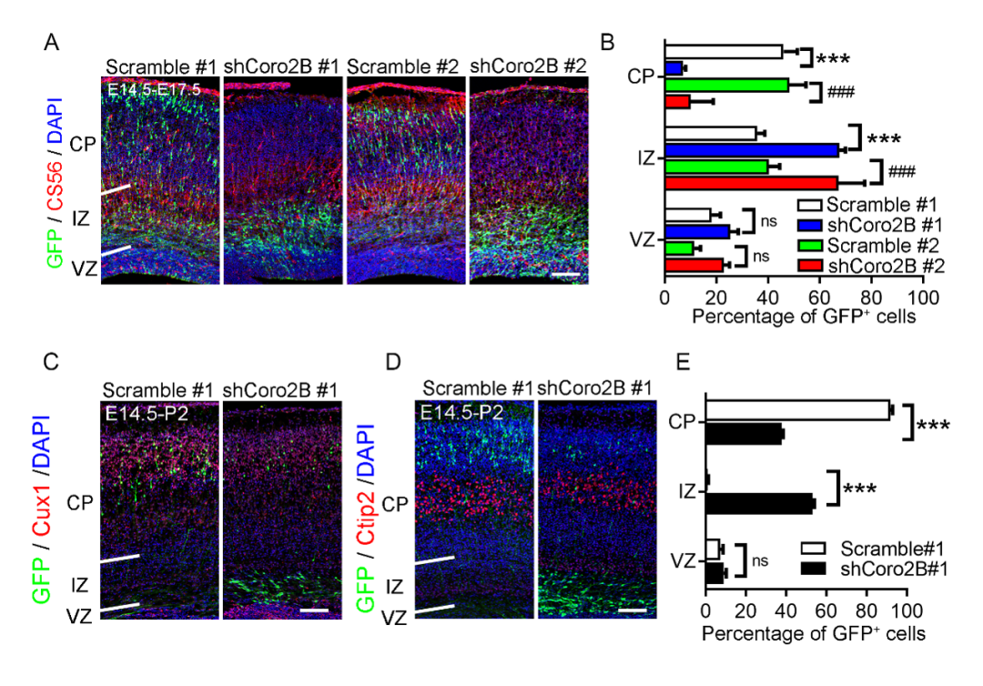 图1. 敲减coronin 2B导致小鼠皮层神经元迁移障碍