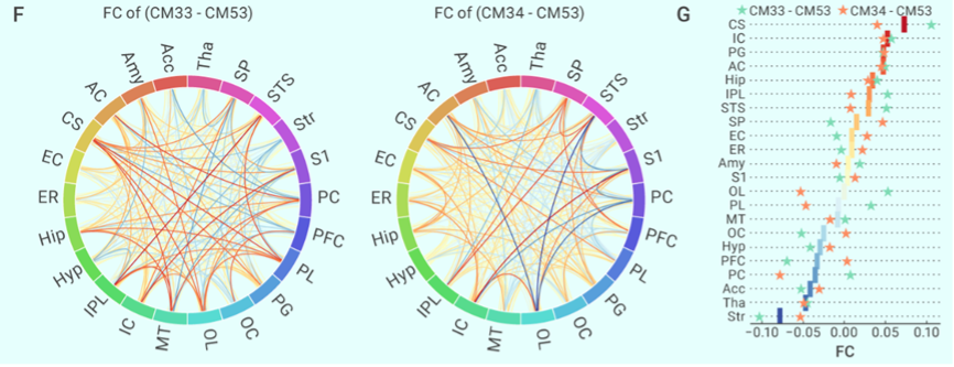为了进一步了解POA调控体温的脑网络机制,作者还通过功能核磁共振成像的方法评估了POA激活前后全脑水平的神经网络变化,发现化学遗传学刺激方法不仅激活了POA局部网络,也特异地激活了与温度、心率以及内感相关的多个核团(如岛叶皮层IC等,图4),从而绘制了体温降低过程中,全脑特异激活的神经网络。