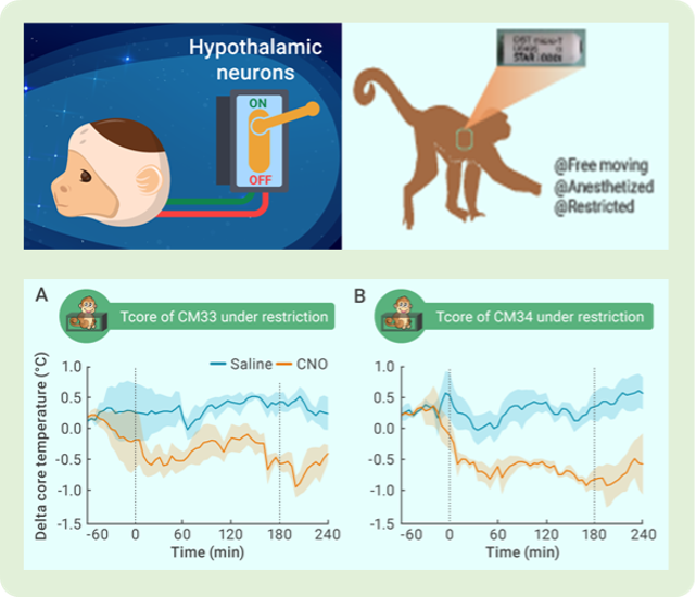 该研究利用化学遗传学手段,通过操控下丘脑兴奋性神经元,首次实现了灵长类动物的可靠体温调节。该研究还探索了灵长类体温调节中枢的功能以及神经网络连接,为潜在的临床转化和空间应用提供理论和实验支撑。