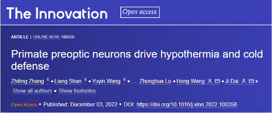 Zhiting Zhang#, Liang Shan#, Yuyin Wang#, Wenfang Li, Minqing Jiang, Feng Liang, Shijing Feng, Zhonghua Lu, Hong Wang*, Ji Dai*. Primate Preoptic Neurons Drive Hypothermia and Cold Defense. The Innovation, 2023, 4:100358. doi: https://doi.org/10.1016/j.xinn.2022.100358