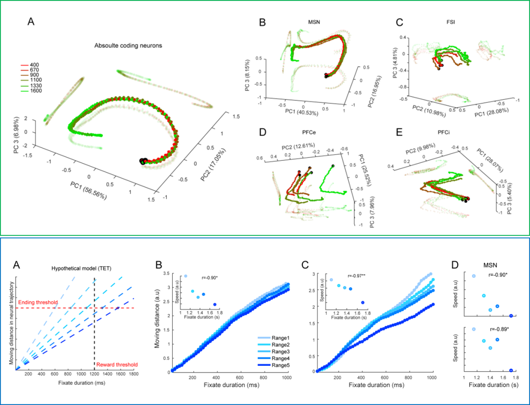 研究人员分别对前额叶(PFC)以及纹状体的神经元波形数据进行降维聚类,区分了纹状体中棘神经元(Medium spiny neuron, MSN)和中间神经元(Fast-spiking interneuron, FSI)信号,以及PFC中兴奋性神经元(PFCe)及抑制性神经元(PFCi)信号。研究人员发现,MSN有最高比例的神经元展示了“绝对编码”或“相对编码”的反应模式。在主成分空间描述神经元活动变化的“神经轨迹”的变化速度,能够表征猕猴在TBT以及TET中时距知觉行为的差异(图3):即MSN集群变化的速度越快,猕猴在TBT中越倾向于判断为“长”,而在TET中的注视时长会缩短。这提示了猕猴的主观时长变化速度与MSN的活动速度成正相关,这些结果强调了MSN在编码主观时长信息中的重要作用。