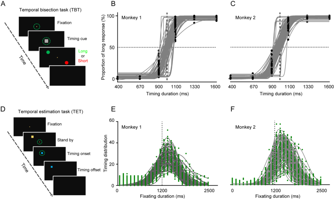 本研究对猕猴开展了两项时距知觉任务的训练,分别是时间分辨任务(Temporal bisection task, TBT)和时间估计任务(Temporal estimation task, TET)(图1)。其中,TBT任务是向猕猴呈现时长不定(0.4、0.67、0.9、1.1、1.33、1.6s)的视觉刺激,并要求猕猴在视觉刺激消失后判断刺激的呈现时长是比 1s 长还是短。结果表明,刺激呈现时长越长,其判断为“长”的概率就越高,表明猕猴掌握了 TBT 任务的规则。在 TBT 中,猕猴是在刺激消失后才对其呈现时长进行判断,属于回顾性计时。而TET任务则是给猕猴呈现一个视觉刺激,并由其通过注视决定在何时结束该刺激的呈现。当猕猴对刺激的注视时长处于 1.2 – 2.5s 之间时,能够获得奖赏。结果显示,猕猴也成功掌握了该计时规则。在 TET 中,猕猴对注视时长有预期,且需要在判断注视时长到达阈限后结束注视,属于前瞻性计时。