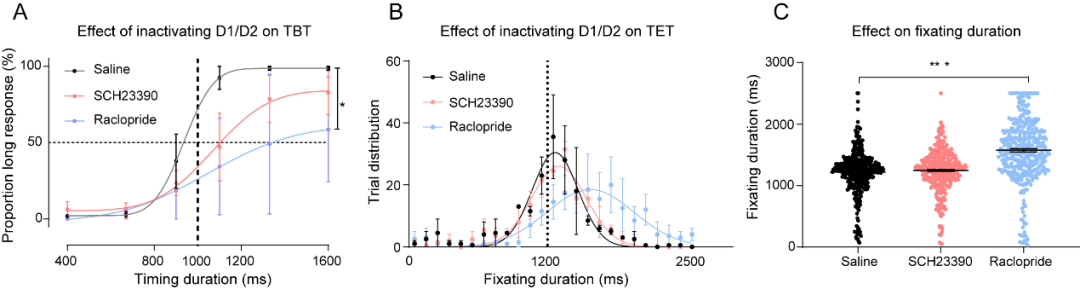 由于MSN神经元具有不同的亚型,为了区分是哪些亚型神经元在主导时间知觉加工,研究人员进一步通过药理学实验,分别失活D1-MSN和D2-MSN,考察不同类型MSN神经元的作用。他们发现,失活D2-MSN能够显著降低猕猴在TBT中判断为“长”的概率,以及延缓在TET的注视时长(图4)。这一结果提示了D2-MSN是表征生物“Internal clock”的关键亚型神经元。由于D2-MSN在运动控制、计划、行为转换中扮演关键角色,这一结果也提示了时距知觉与运动控制的紧密联系。