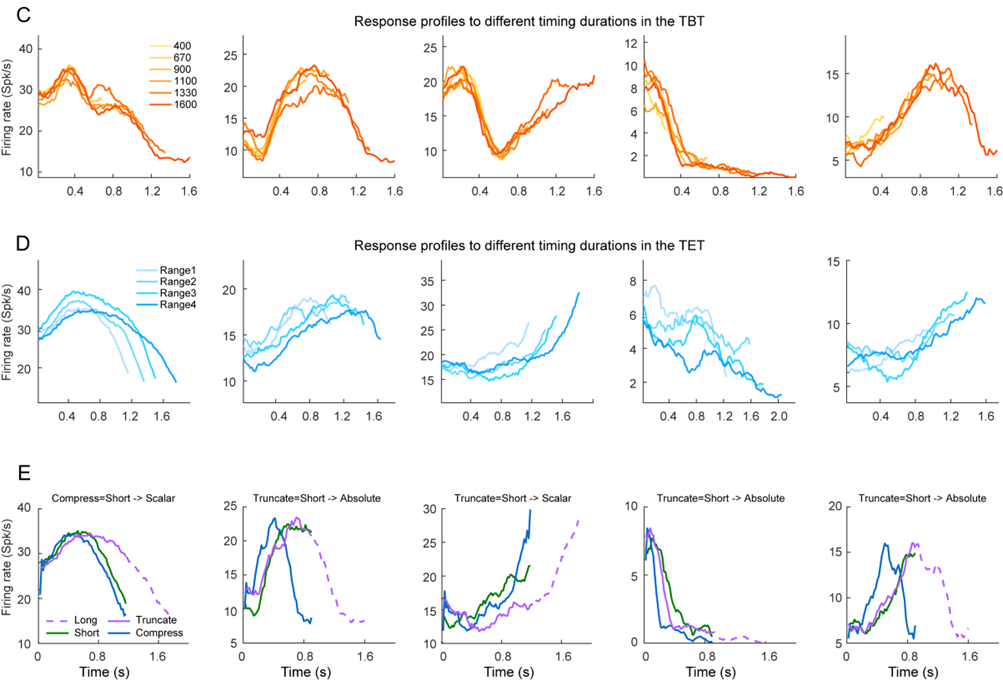 研究人员通过植入慢性可移动电极,从猕猴的前额叶和纹状体记录了3000多个神经元对两项时距知觉任务的反应。在TBT中,猕猴无法预期视觉刺激的呈现时间,无论计时的长短,许多神经元的发放率并未随着刺激呈现时长变化而改变其发放模式,称为“绝对编码模式(Absolute coding)”。在TET中,许多神经元的发放率对不同主观时长呈现相似的模式,并可通过压缩实现对齐,称为“可压缩编码(Scalar coding)”,也称 “相对编码模式(Relative coding)”。这一结果提示了神经元以不同的模式编码前瞻性和回顾性计时中的时间信息(图2)。