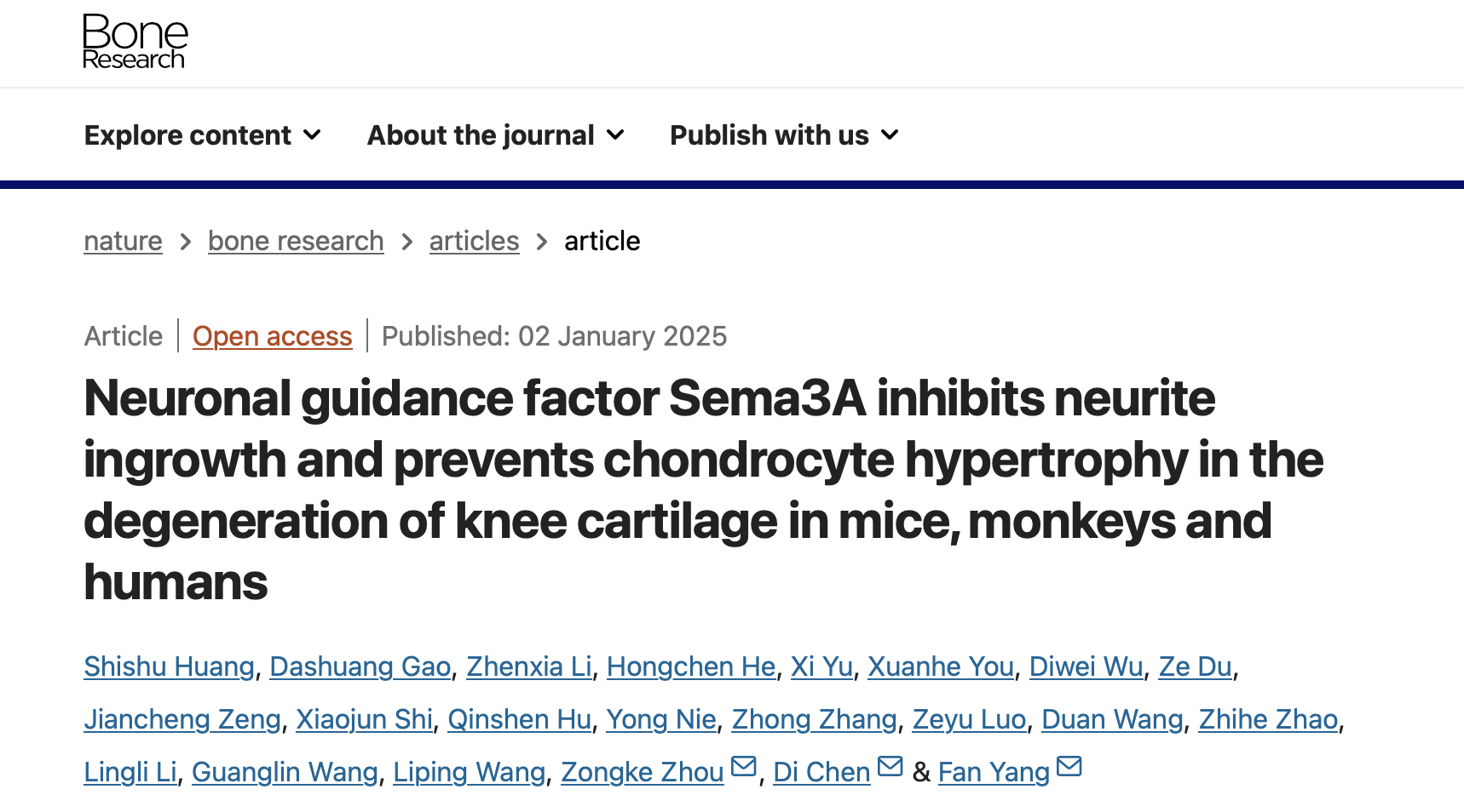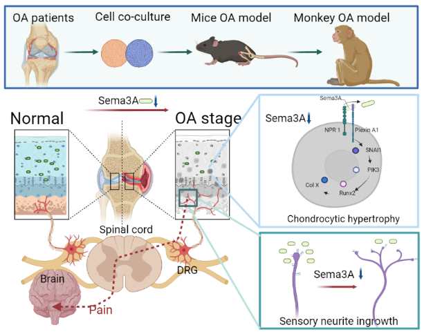 2025年1月2日,中国科学院深圳先进技术研究院脑认知与脑疾病研究所杨帆研究员团队、生物医药与技术研究所陈棣教授团队联合四川大学华西医院周宗科主任团队在这一领域取得重要突破,相关研究“Neuronal guidance factor Sema3A inhibits neurite ingrowth and prevents chondrocyte hypertrophy in the degeneration of knee cartilage in mice, monkeys and humans”发表于Bone Research杂志(IF=14.3)。