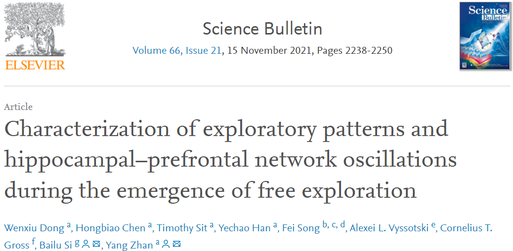 2021年11月15日,由詹阳研究员团队牵头,联合北京师范大学系统科学学院、以及中国科学院沈阳自动化研究所机器人技术国家重点实验室等组成的跨学科团队在Science Bulletin 在线发表题为“Characterization of exploratory patterns and hippocampal–prefrontal network oscillations during the emergence of free exploration” 研究的文章。