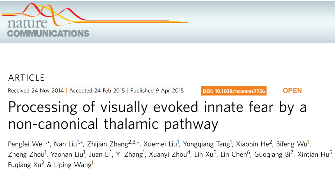 2015年4月9日,王立平研究员和蔚鹏飞副研究员团队在Nature Communications上在线发表了题为“Processing of visually evoked innate fear by a non-canonical thalamic pathway” 的研究论文。