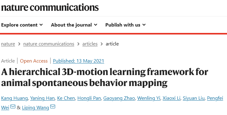 2021年5月13日,王立平研究员与蔚鹏飞研究员团队在Nature Communications上在线发表了题为“A Hierarchical 3D-motion Learning Framework for Animal Spontaneous Behavior Mapping” 的研究论文。