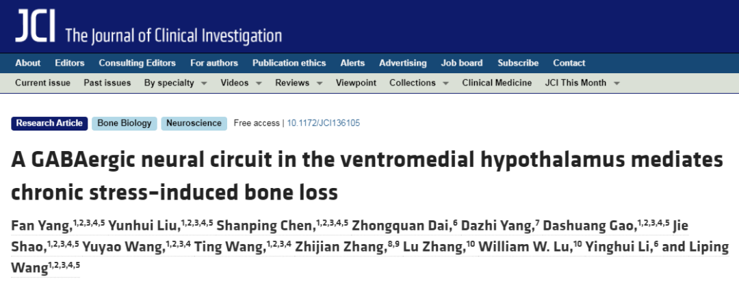 2020年9月10日,由杨帆研究员和王立平研究员团队牵头,联合中国航天员科研训练中心李莹辉教授团队,在Journal of Clinical Investigation在线发表题为“A GABAergic neural circuit in the ventromedial hypothalamus mediates chronic stress–induced bone loss” 的文章。