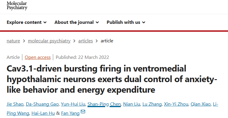 2022年3月22日,杨帆研究员团队在Molecular Psychiatry上发表题为“Cav3.1-driven bursting firing in ventromedial hypothalamic neurons exerts dual control of anxiety-like behavior and energy expenditure” 的研究成果,揭示了慢性压力应激中下丘脑腹内侧核团(Ventromedial hypothalamus, VMH)神经元的簇状放电对焦虑及能量代谢的调控作用,而钙离子通道Cav3.1在上述调控中扮演了重要角色。该研究成果不仅深入解析了压力应激导致焦虑与代谢异常的神经机制,也为干预焦虑应激相关疾病提供新的干预策略。