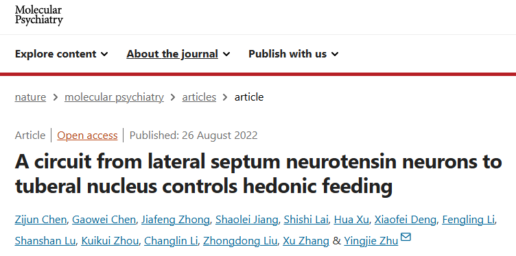 2022年8月26日,朱英杰研究员团队在Molecular Psychiatry在线发表题为“A circuit from lateral septum neurotensin neurons to tuberal nucleus controls hedonic feeding” 的研究论文。
