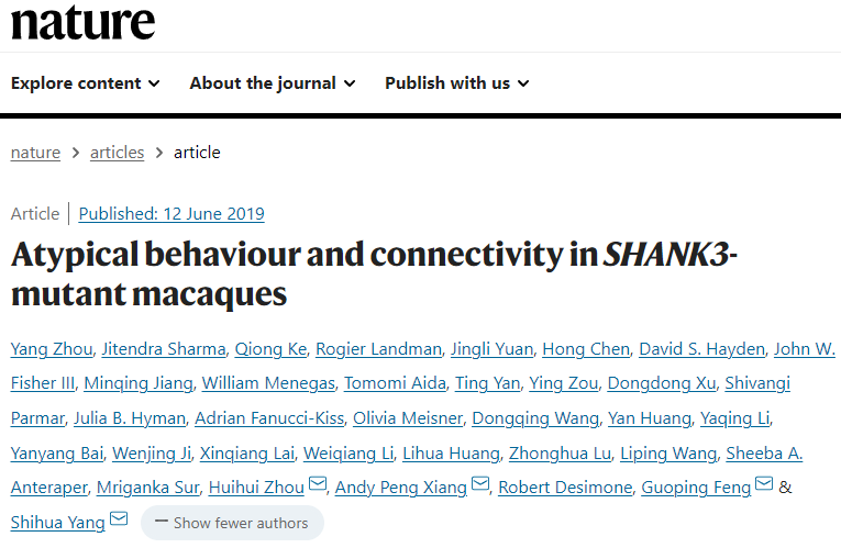2019年6月12日,依托脑认知与脑疾病研究所建设的非人灵长类研究平台,深港脑院和筹建中的深圳市脑解析与脑模拟重大科技设施研究平台,深圳先进院周晖晖/王立平/路中华团队,联合美国麻省理工学院、中山大学、华南农业大学等国际团队,在国际顶级学术期刊Nature上发表题为“Atypical behaviour and connectivity in SHANK3 -mutant macaques” 的研究文章。