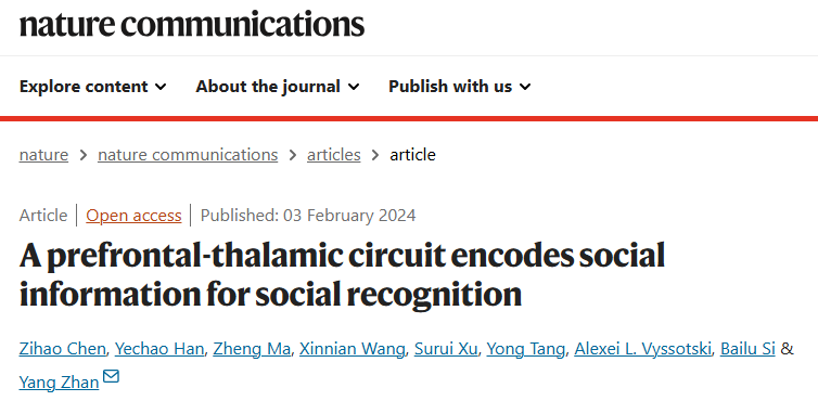 2024年2月3日,詹阳研究员团队在Nature communications 杂志在线发表题为“A prefrontal-thalamic circuit encodes social information for social recognition” 研究论文。