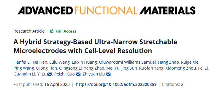 2023年4月16日,深圳先进院鲁艺研究员团队、刘志远研究员团队和青岛大学郭培志团队合作在Advanced Functional Materials杂志在线发表了题为“A Hybrid Strategy-Based Ultra-Narrow Stretchable Microelectrodes with Cell-Level Resolution” 的研究论文。