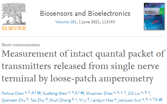 2021年6月1日,孙坚原研究员、陈培华副研究员,申雪峰副研究员团队牵头,联合南方科技大学、中国科学院生物物理研究所及中国科学院化学研究所等组成的跨学科团队,在Biosensors and Bioelectronics 在线发表题为“Measurement of intact quantal packet of transmitters released from single nerve terminal by loose-patch amperometry” 的文章。
