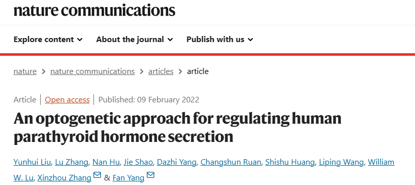 2022年2月9日,杨帆研究员团队的最新研究成果“An optogenetic approach for regulating human parathyroid hormone secretion” 在Nature Communications 上线发表。