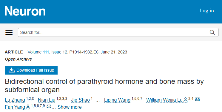 2023年4月20日,杨帆研究员团队在Neuron期刊在线发表题为“Bidirectional Control of Parathyroid Hormone and Bone Mass by Subfornical Organ” 的研究论文。