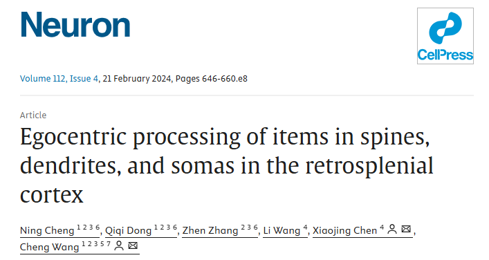 2024年2月21日,王成研究员团队在Neuron期刊在线发表题为“Egocentric processing of items in spines, dendrites, and somas in the retrosplenial cortex” 的研究论文。