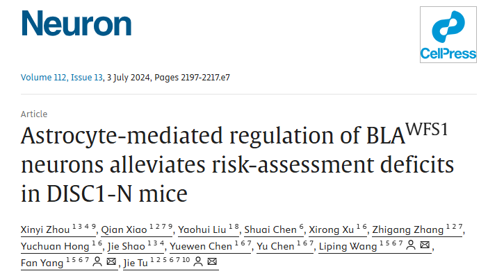 2024年4月19日,屠洁研究员团队在Neuron杂志在线发表了题为“Astrocyte-mediated regulation of BLAWFS1 neurons alleviates risk-assessment deficits in DISC1-N mice” 的研究论文,首次揭示了基底外侧杏仁核(basolateral amygdala, BLA)脑区的星形胶质细胞可以通过WFS1神经元调控DISC1小鼠的异常风险评估行为,详细描述了小鼠的BLA星形胶质细胞在动物危险决策的时候,会通过释放D-serine调控临近的谷氨酸能神经元活动,发挥风险评估并产生适当回避行为的机制。