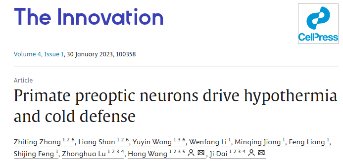 2022年12月5日,戴辑副研究员和王虹研究员团队在The Innovation期刊在线发表题为“Primate Preoptic Neurons Drive Hypothermia and Cold Defense” 的研究论文。