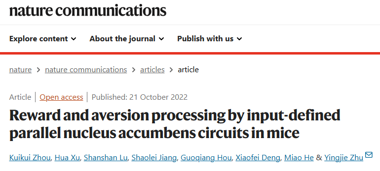 2022年10月21日,朱英杰研究员团队在Nature Communications 上发表了题为“Reward and aversion processing by input-defined parallel nucleus accumbens circuits in mice” 的文章,揭示了伏隔核两条平行环路分别调控奖赏和厌恶行为。