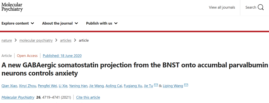 2020年6月18日,屠洁研究员与王立平研究员团队在Molecular Psychiatry上在线发表题为“A new GABAergic somatostatin projection from the BNST onto accumbal parvalbumin neurons controls anxiety” 的研究论文。