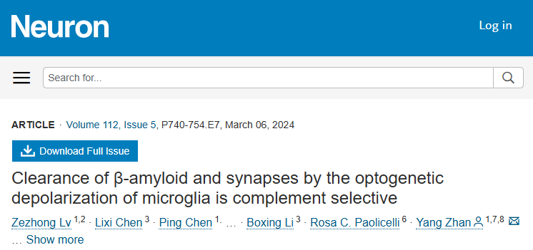 2024年1月30日,詹阳研究员团队在Neuron杂志在线发表题为“Clearance of β-amyloid and synapses by optogenetic depolarization of microglia is complement selective” 研究论文。