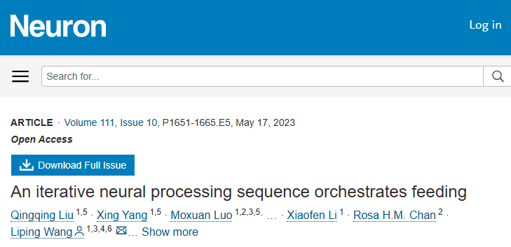 2023年3月15日,王立平研究员团队在Neuron 期刊在线发表题为“An iterative neural processing sequence orchestrates feeding” 的研究论文。