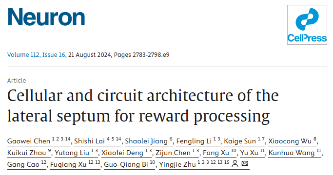 2024年8月21日,朱英杰研究员团队在神经科学国际期刊Neuron期刊发表了题为“Cellular and circuit architecture of the lateral septum for reward processing” 的封面文章。